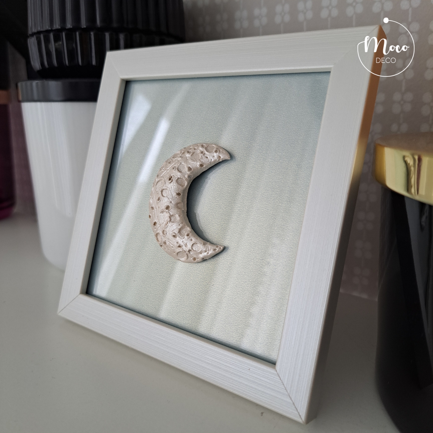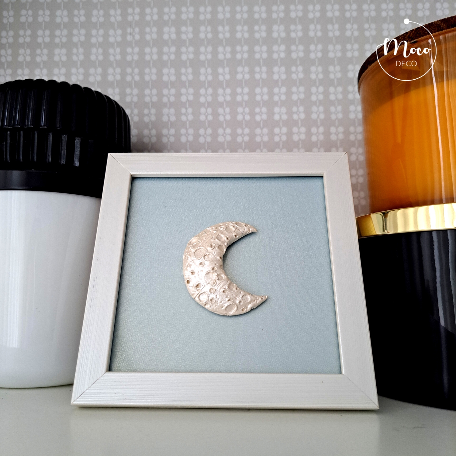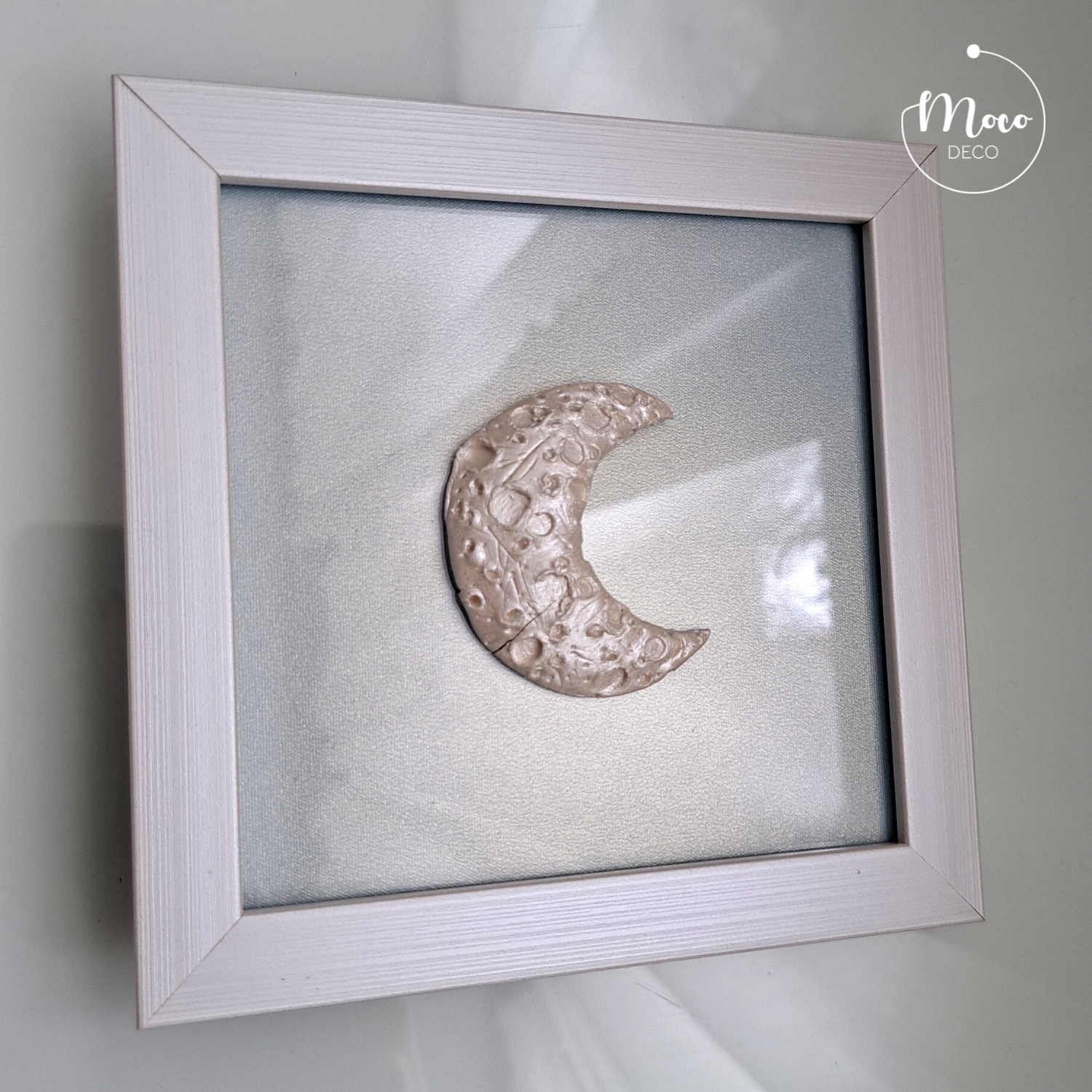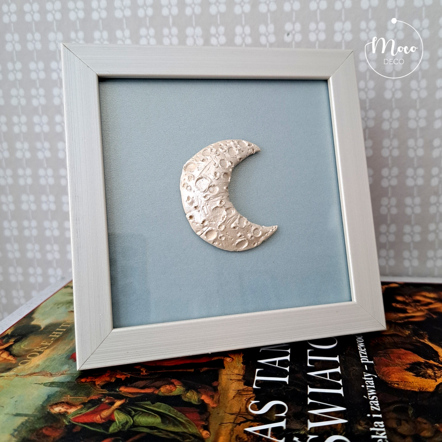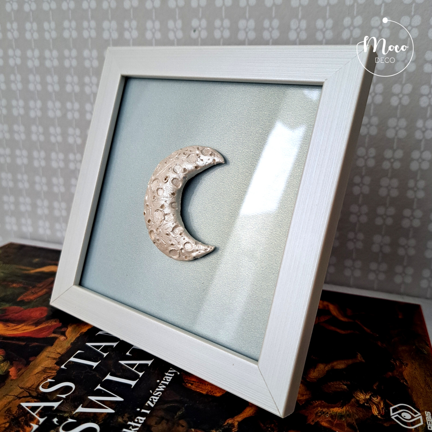 Dekoracyjny księżyc wykonany ręcznie z masy ceramicznej pokrytej perłową farbą akrylową, zabezpieczony werniksem. Tło wykonane z szarobłękitnego papieru, mieniącego się perłowo-złotą poświatą pod szkłem. Biała ramka posiada uchwyt do zawieszenia oraz stopkę.